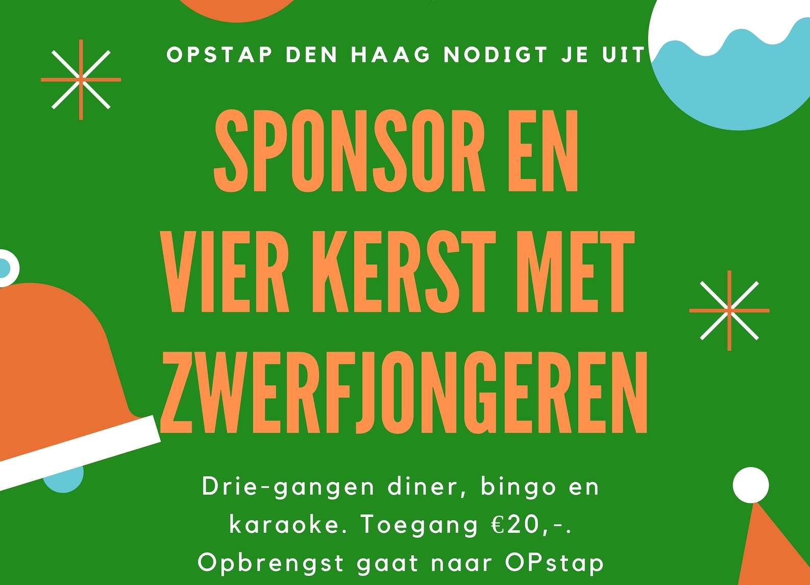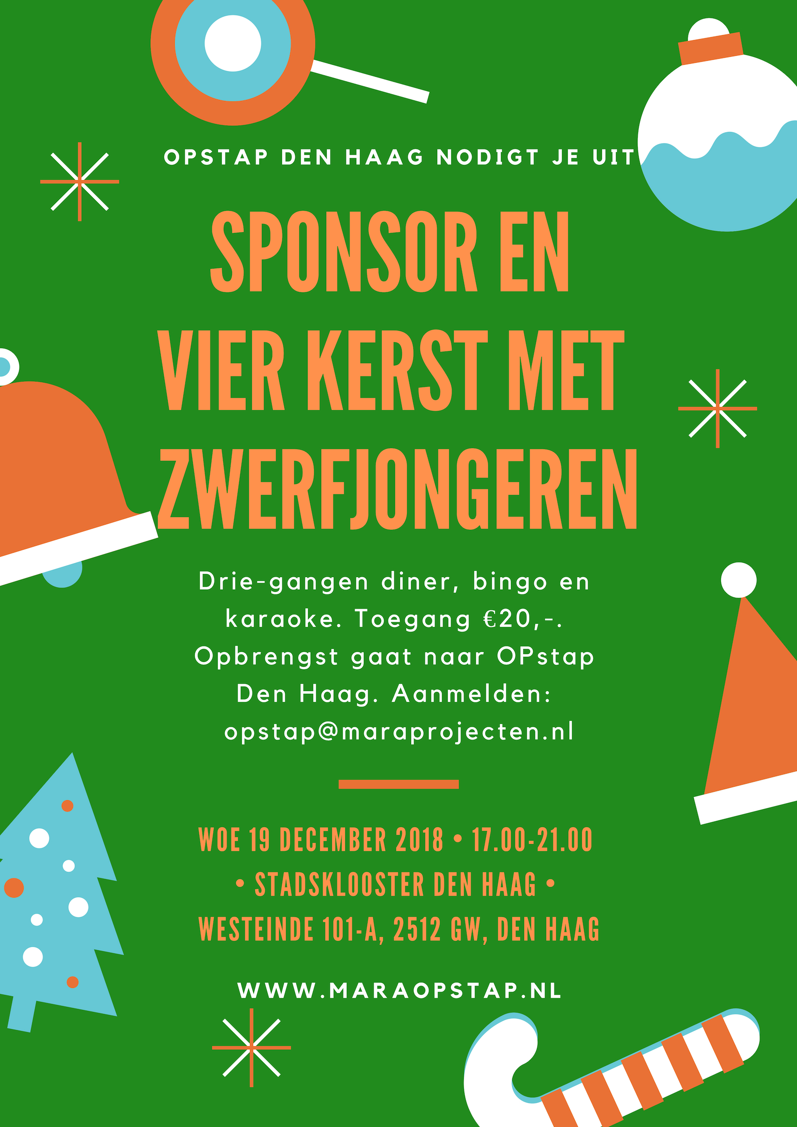 DEN HAAG – Jongerenproject OPstap Den Haag nodigt je uit om zwerfjongeren in Den Haag een fijne kerst te bezorgen. Op woensdag 19 december organiseren we in het Stadsklooster een gezellige kerstbijeenkomst voor dak- en thuisloze jongeren. Zij mogen daar gratis aan deelnemen en jij bent van harte uitgenodigd om daar tegen betaling bij aan te sluiten. Op het programma staat een leuke ontmoeting met de jongeren, een drie-gangen diner, bingo en karaoke. Een entreekaartje kost €20,- per persoon. De opbrengst van de kaartverkoop gaat naar het project OPstap Den Haag, zodat we ook in 2019 thuisloze jongeren kunnen blijven helpen. Meer informatie en aanmelden via opstap@maraprojecten.nl.